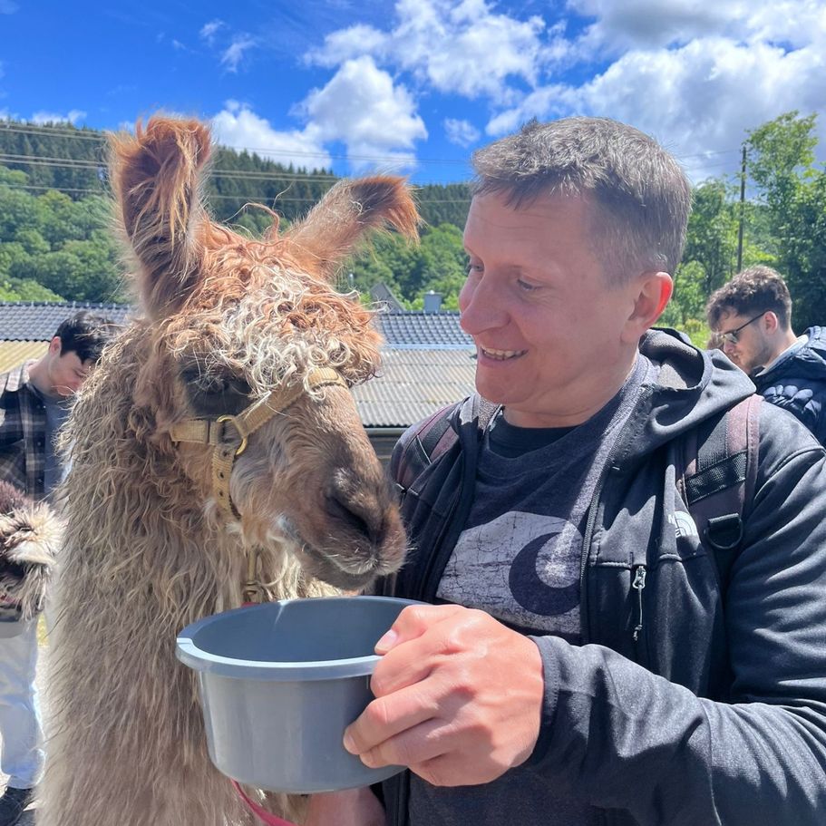 Samson ist eigentlich immer tiefenentspannt. Er ist gerne zu Besuch in Einrichtungen und fährt auch mit dem Aufzug, um die Bewohner in ihren Zimmern zu besuchen. Ihn kann nur eins aus der Ruhe bringen: die Mädels. Samson hat schon für wundervolle kleine Eifel Lamas gesorgt.