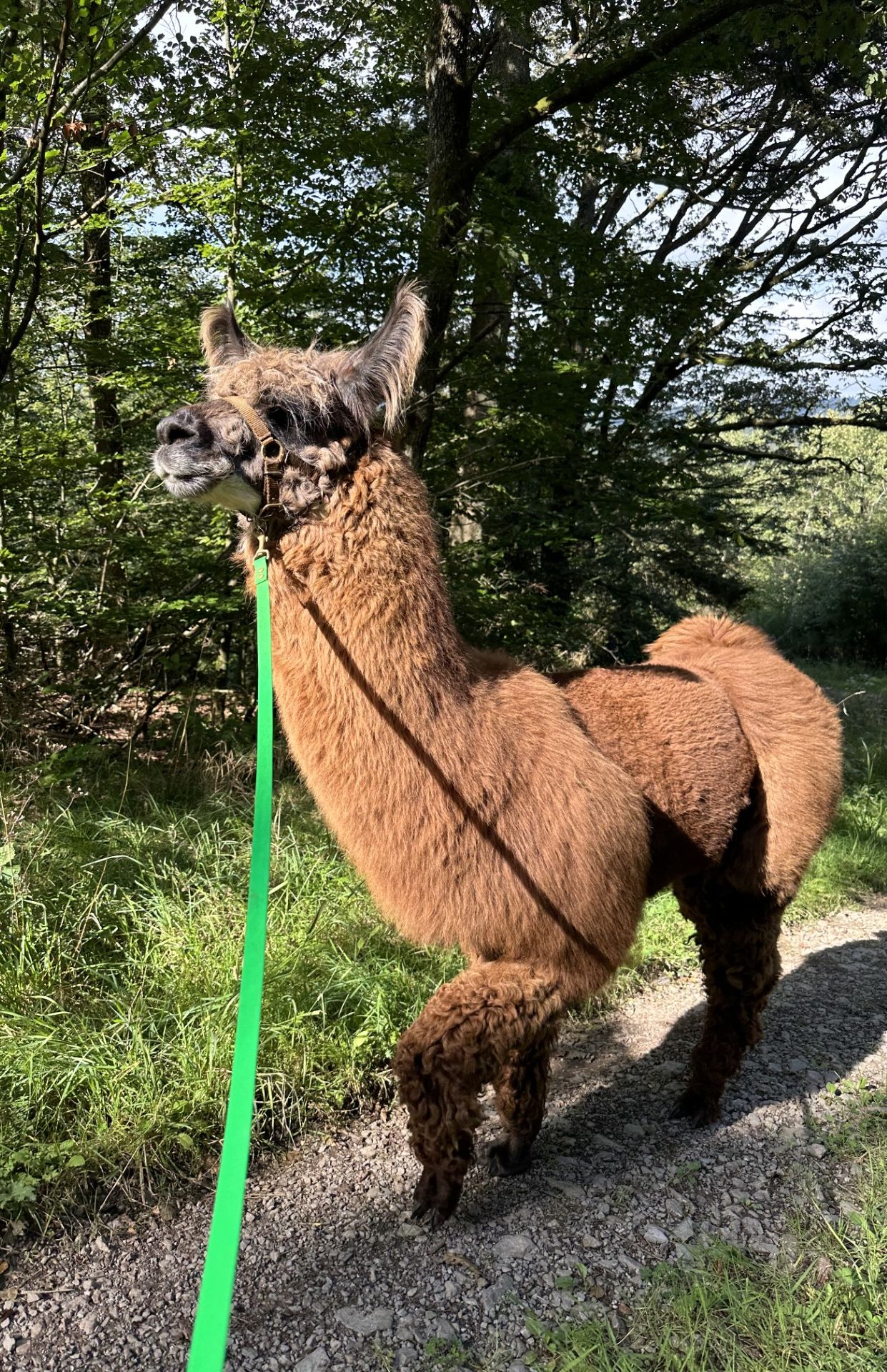 Chocolino hat die längsten Lamawimpern, die es in der Eifel gibt und dazu noch wunderschöne Puschelohren. Seine Ungeduld vor der Wanderung gibt er gerne lautstark durch Summen bekannt. Wenn es dann endlich los geht, ist er ein ruhiger und entspannter Begleiter.